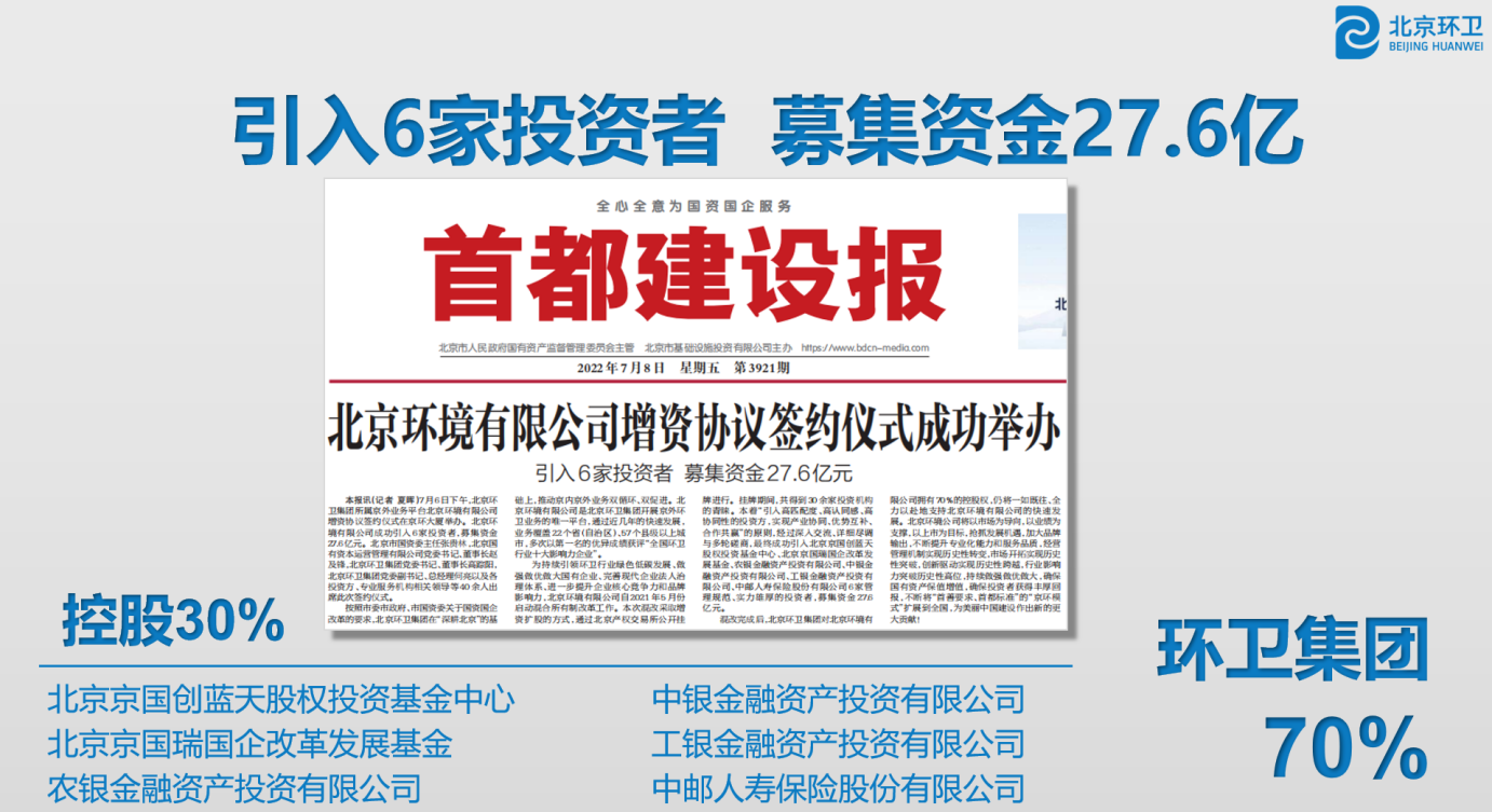 北IM电竞境有限公司作为京外环卫业务唯一平台,业务已覆盖21个省(自治区)、46个县级以上城市,所属项目共计147个,公共空间清洁业务面积共计6.79亿平方米,固废收运业务总量679.17万吨,固废处理业务总量329.19万吨,为属地提供高品质环卫服务。2022年成功引入北京京国创蓝天股权投资基金中心等6家高匹配度、高认同感、高协同性的投资方,募集资金27.6亿元,实现产业协同、优势互补、合作共赢,进一步提升企业经营活力、市场影响力和核心竞争力。