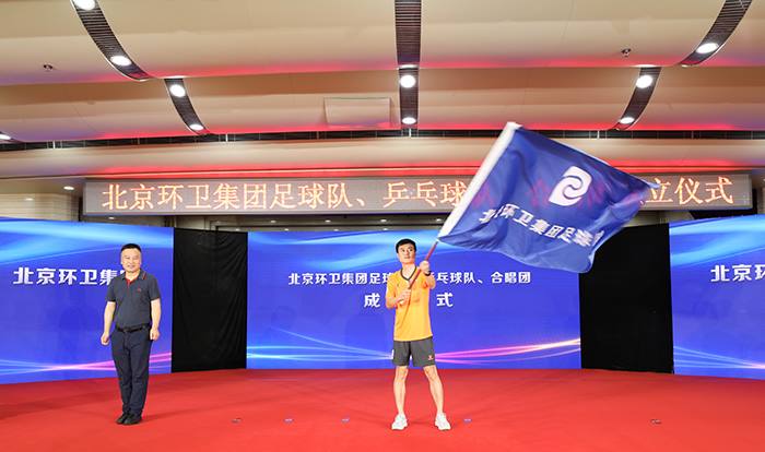 集团党委书记、董事长高踪阳为IM电竞乒乓球队授旗