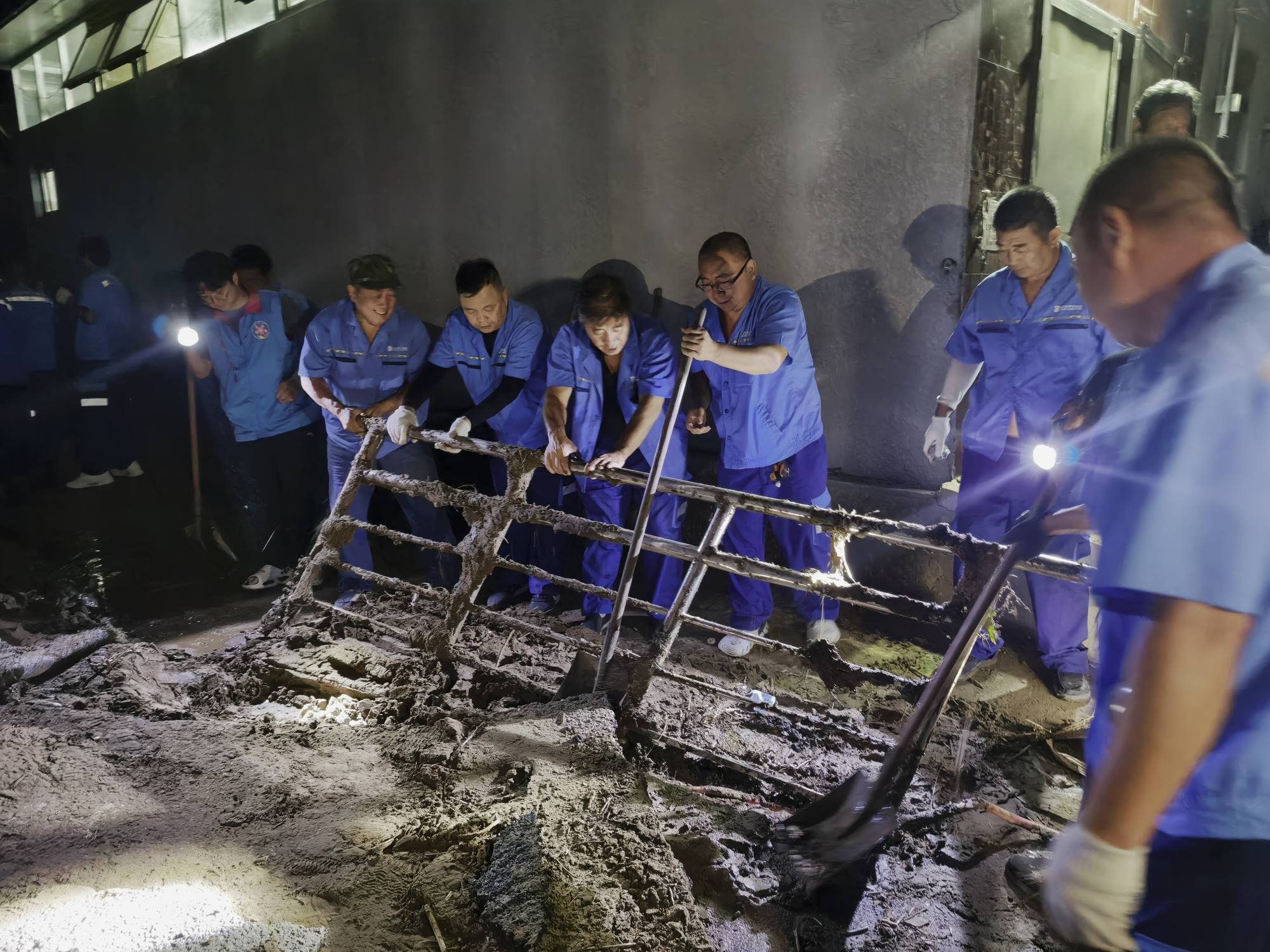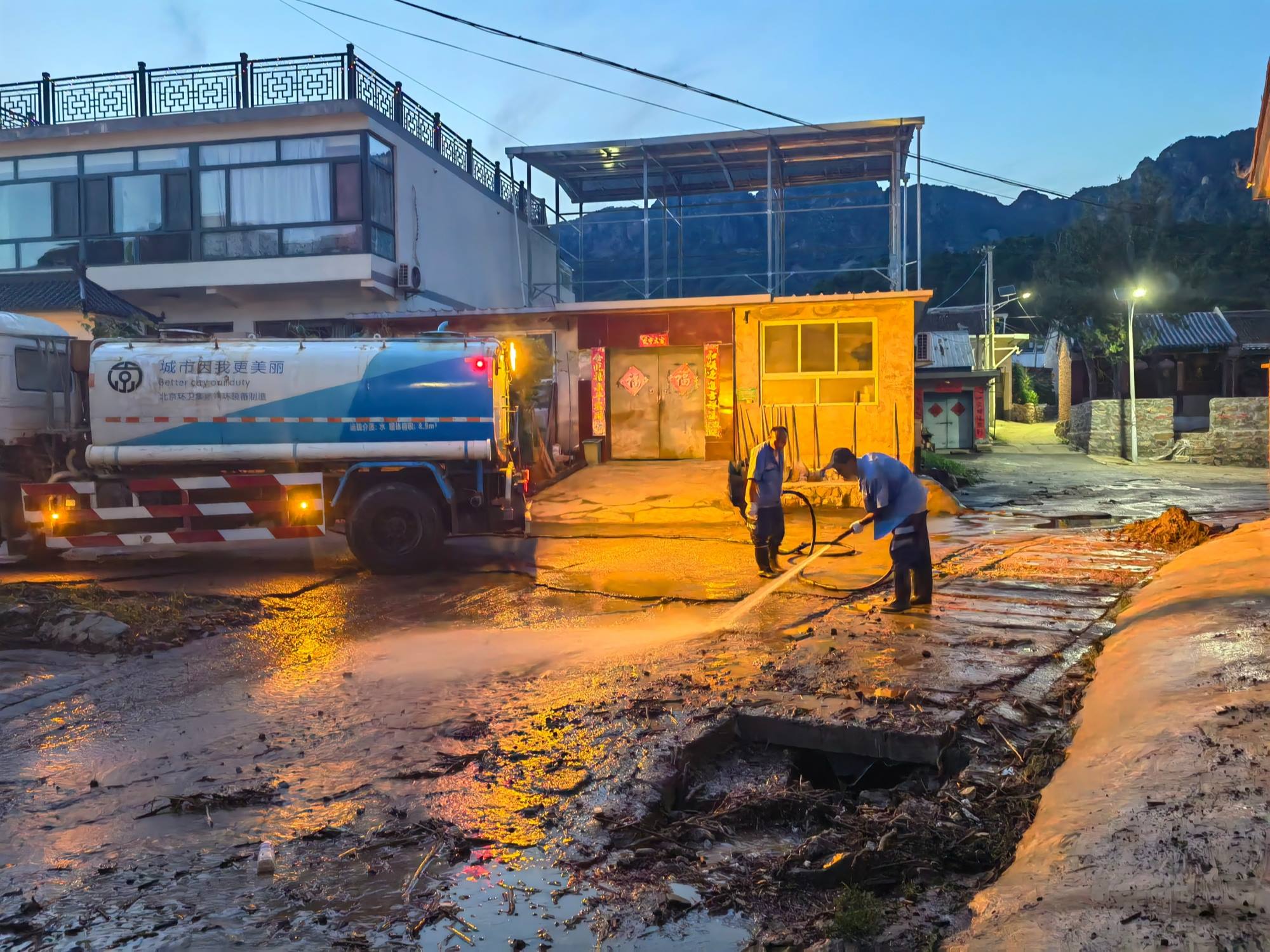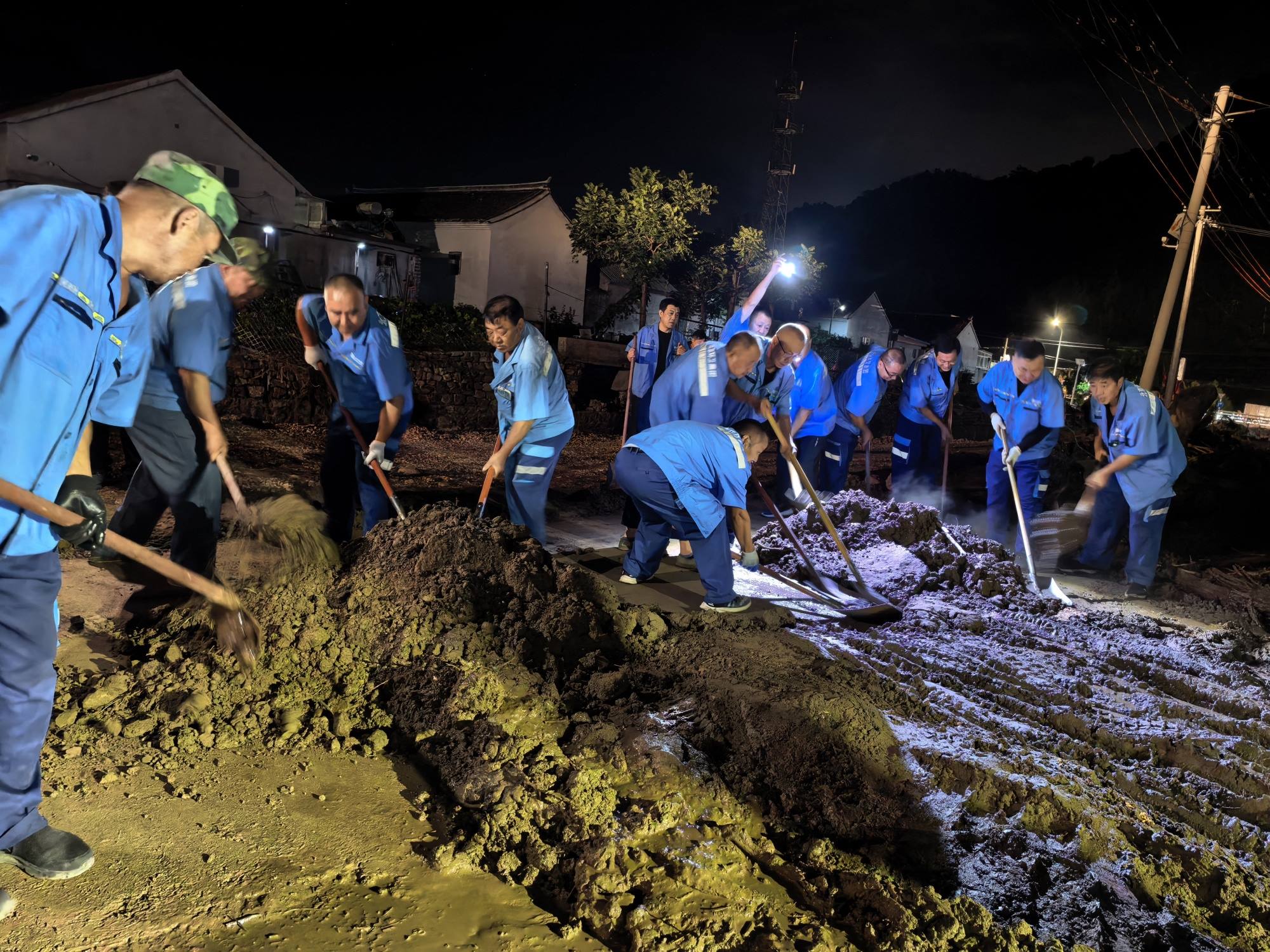 镇罗营镇关上村的夜晚被手电光划破,借助路灯和手电筒的光亮,IM电竞人全力以赴。洪水过后,村里路面上的淤泥很深,污水横流,部分低洼地带甚至形成泥沼,有的轿车深陷在污泥中,有的路段遍布断木杂物,给清淤工作带来很大挑战。为了提升效率,职工们主动配合铲车协同作战,“大水已经把柏油路冲出裂缝,到处是厚厚的淤泥。我们等铲车先推铲一遍后,再用铁锹一点一点地清理,不放过任何一个死角。”平谷公司城市机扫中心机扫队队长齐久松说。清淤现场,铁锹与淤泥、杂物的碰撞声不绝于耳。尽管任务艰巨,但大家毫无怨言,稳步推进着清理进程。面对夜间山区骤降的气温,任何人都没有退缩。为抢抓时间,大伙儿的晚餐也是在马路边简单吃点,匆匆解决。