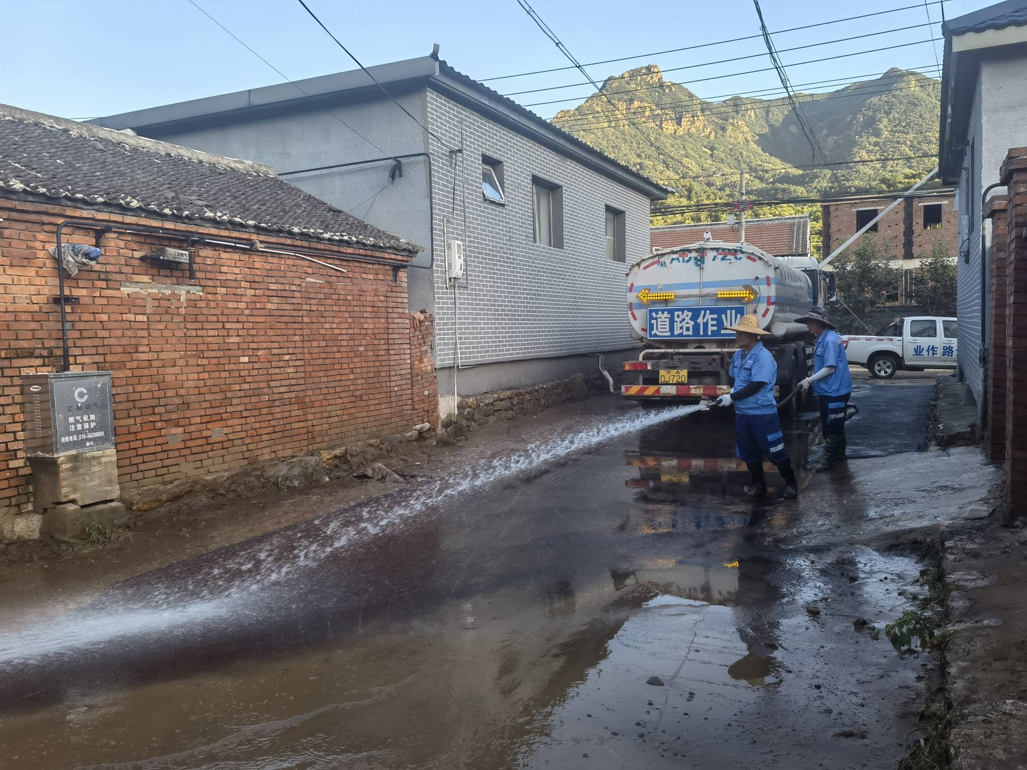 清淤过程中,平谷公司调来6辆洒水车,水洗降尘与人工作业紧密协同。大家利用洒水车反复冲洗路面,作业人员手持高压水枪,对准顽固淤泥强力冲刷,再以铁锹细致清理残留杂物,确保路面彻底恢复整洁。“通过人机的高效协作,我们的工作进度快了许多,道路慢慢恢复本色。”望着一条条被打通的道路,平谷公司城市机扫中心负责人倪小军终于松了一口气。