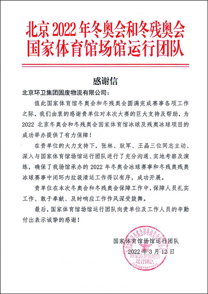 国家速滑馆场馆运行团队感谢信