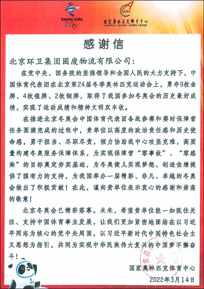 国家奥林匹克体育中心感谢信